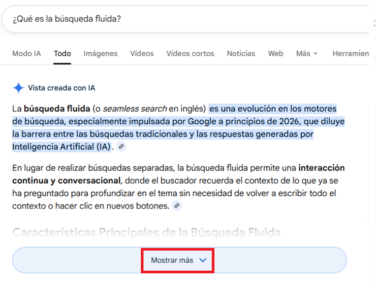 El cambio ya es visible en LATAM porque, mientras que hasta ahora en España cuando haces una consulta y se despliega un AI Overview el usuario permanece dentro del bloque de resumen ampliado, en LATAM (como ya ocurre en EE. UU.) la transición hacia Google AI Mode se produce de forma fluida directamente desde ese resumen. Puede parecer un pequeño gesto de producto, casi imperceptible a nivel de interfaz, pero estratégicamente es enorme porque elimina el último microsegundo de decisión antes de hacer clic en un resultado orgánico.