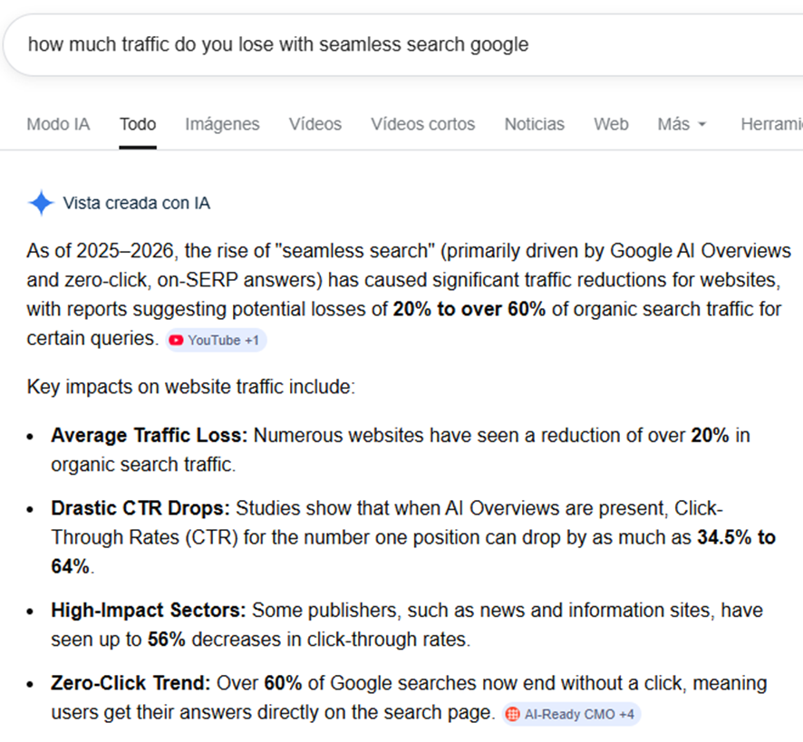 Si ante una búsqueda informacional los AI Overviews aparecen ya en el 99% de los casos, con una pérdida media aproximada del 30% del tráfico, el Google AI Mode puede acelerar esa caída hasta el 80%. Con la llegada de la búsqueda fluida, el escenario es claro: reducciones de tráfico orgánico de hasta la mitad respecto a la era pre-IA. No es una hipótesis. Es una transición ya en marcha.